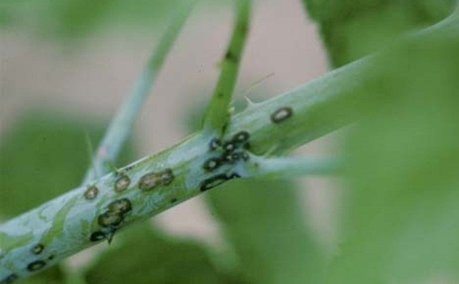 - Рак стеблей, или язвенная пятнистость, сильно замедляет развитие всего куста