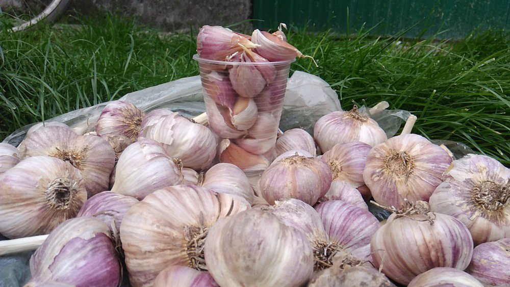 - Головки чеснока Любаша очень крупные, с 4–6 зубками фиолетового цвета